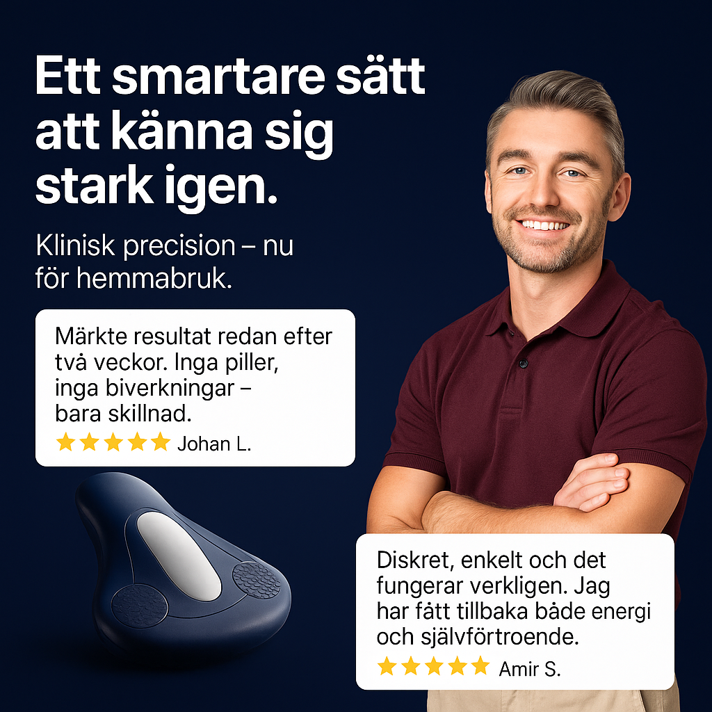 SereniMen™ är utvecklad för män som vill återfå styrka, blodflöde och trygghet på riktigt. Med hjälp av riktade vibrationsprogram aktiverar SereniMen™ de djupa musklerna i bäckenbotten de som påverkar både din prestation och ditt självförtroende. Du tränar helt klädd, hemma i lugn och ro, bara några minuter om dagen. På så sätt återfår du kontroll, uthållighet och trygghet i stunden.